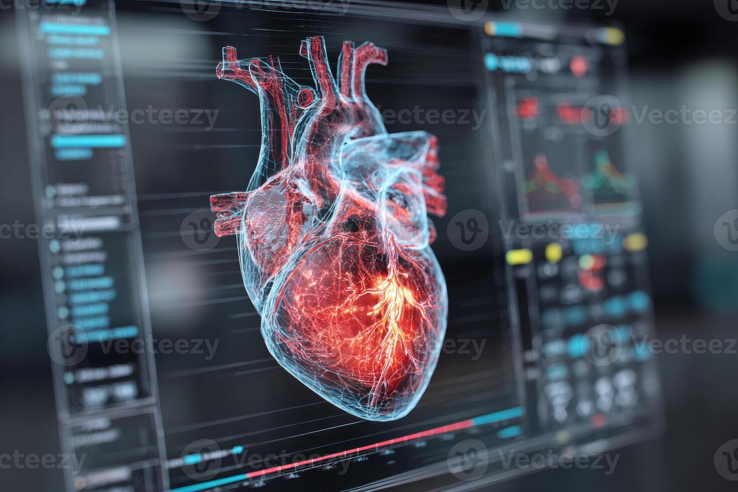 Close-up view of a high-tech medical workstation showcasing a detailed 3D model of a human heart created from CT scans. The digital display presents intricate anatomical features in 8K resolution Pro Photo