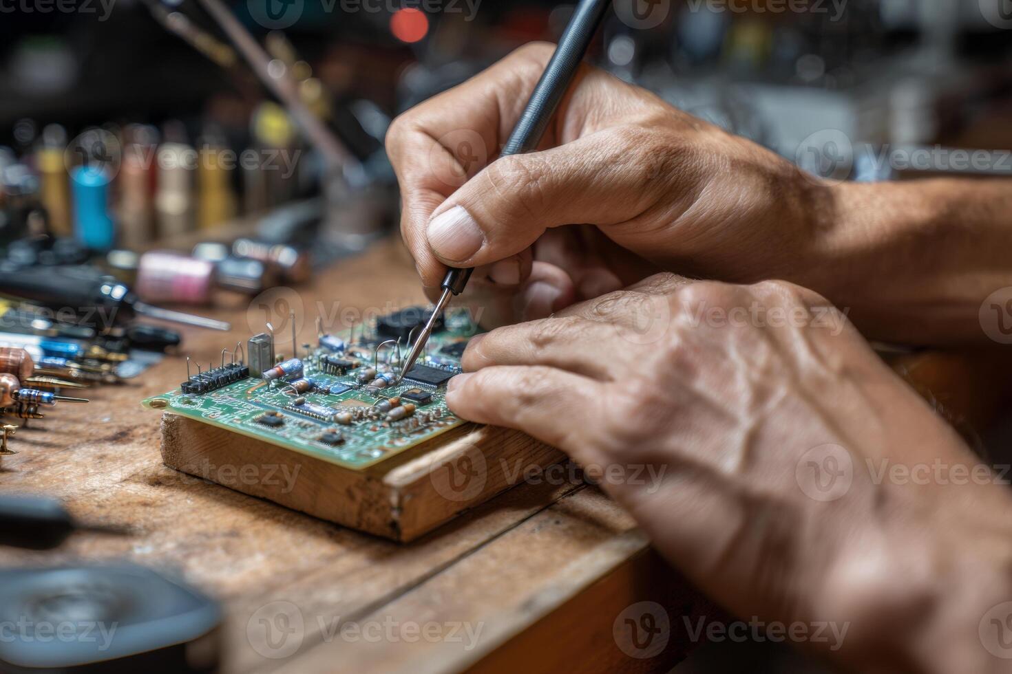 Hands carefully assemble a partially built circuit board using precision tools on a cluttered workbench. The environment reflects a dedicated workshop atmosphere, showcasing intricate details Pro Photo
