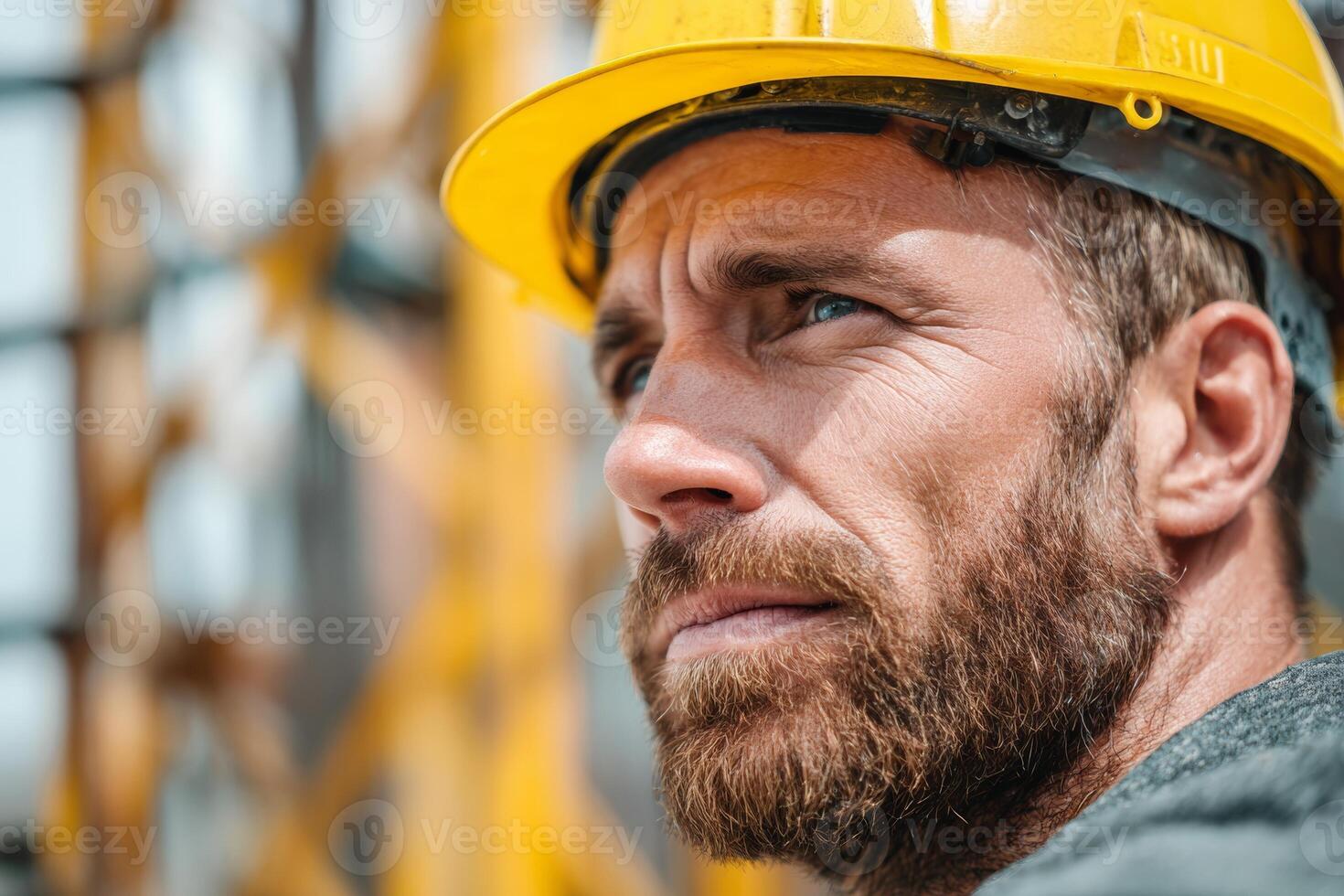 A construction worker wearing a yellow hard hat observes the progress of a building project. The setting features cranes and building materials under clear skies, highlighting a busy work environment Pro Photo