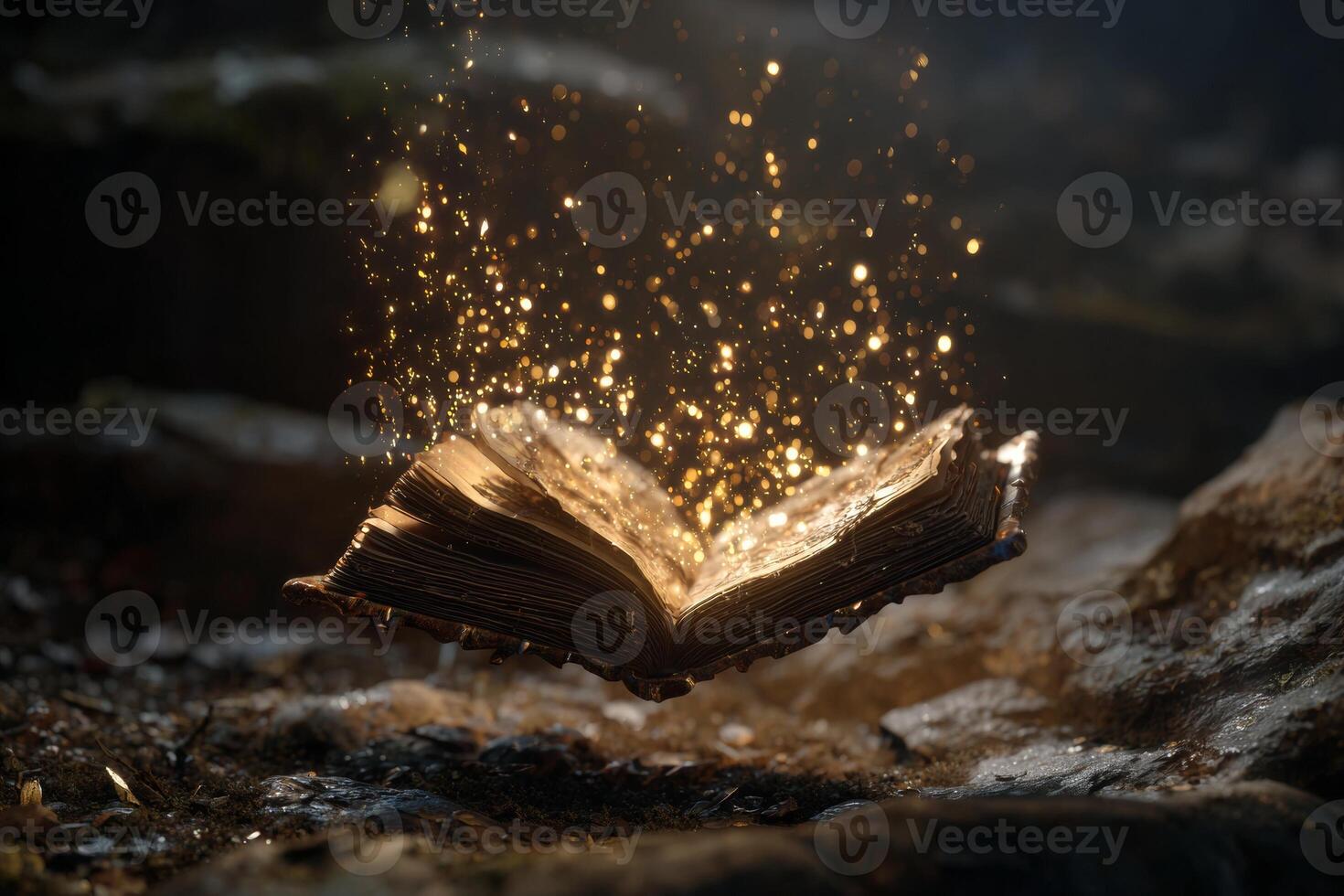 A spellbook floats effortlessly above the ground, its pages aglow and turning by themselves. Surrounding it are shimmering sparkles, creating a mystical atmosphere in a serene forest setting Pro Photo