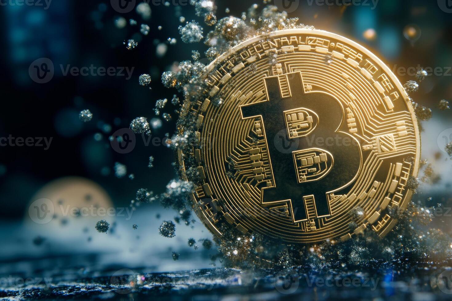 A Bitcoin coin is shown breaking apart into digital particles, illustrating the concept of decentralization and the essence of the digital currency. The vibrant details enhance its futuristic aspect Pro Photo