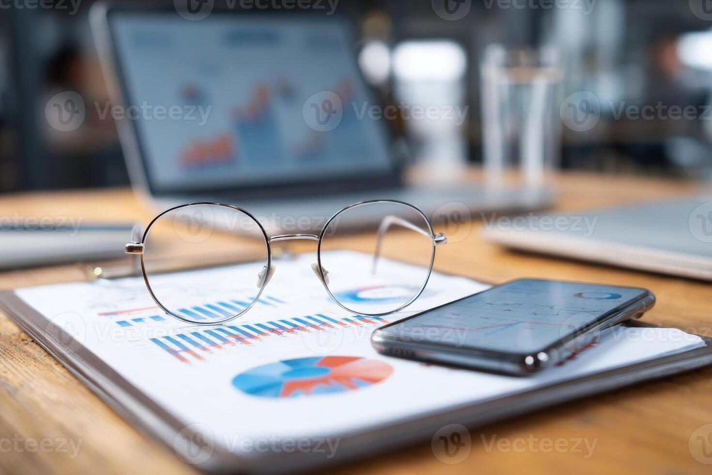 Close-up view of a desktop setup that includes a notebook with analytics charts, glasses, and a smartphone. A team can be seen collaborating in the blurred background of a startup environment Pro Photo
