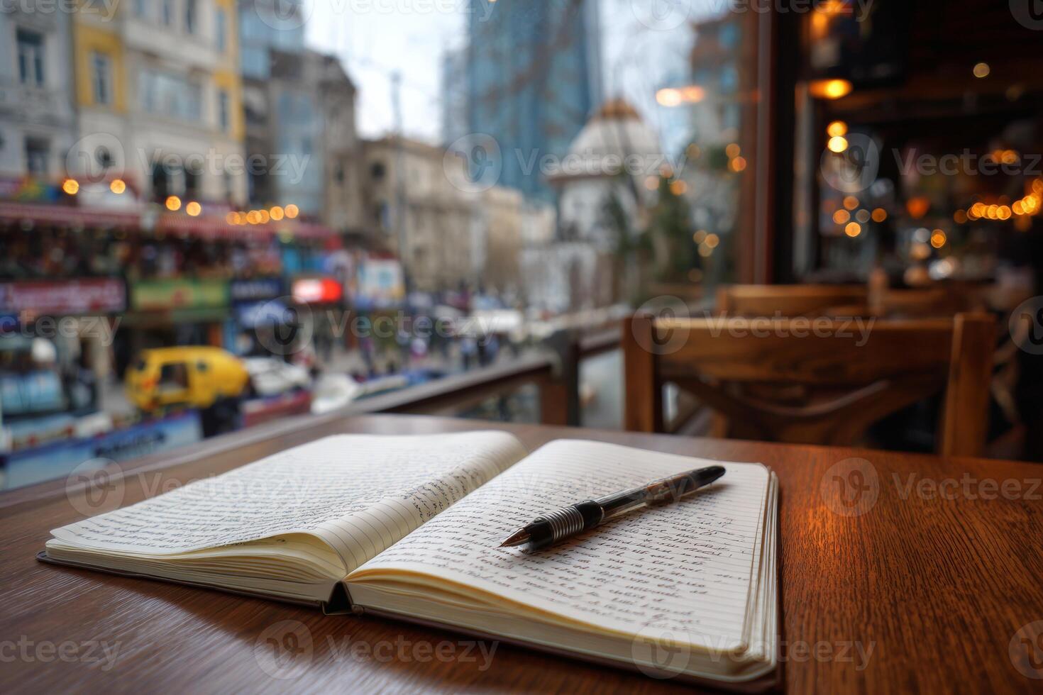 A close-up view of an open notebook on a rustic cafe table, featuring an unfinished letter and a pen Pro Photo
