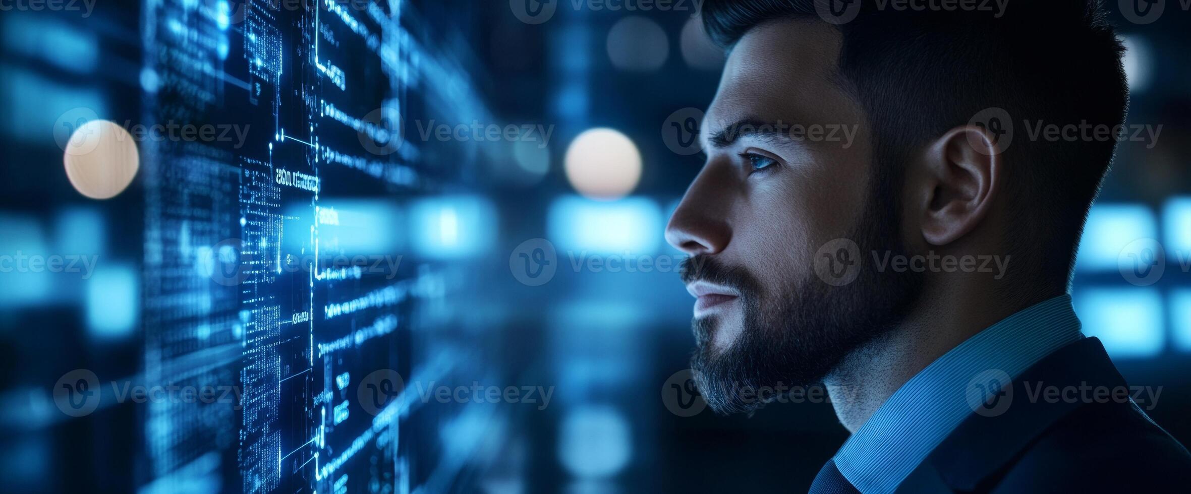 A business man gazes intently into the future of technology, surrounded by visual representations of artificial intelligence in dark blue hues, reflecting on innovative possibilities ahead Pro Photo