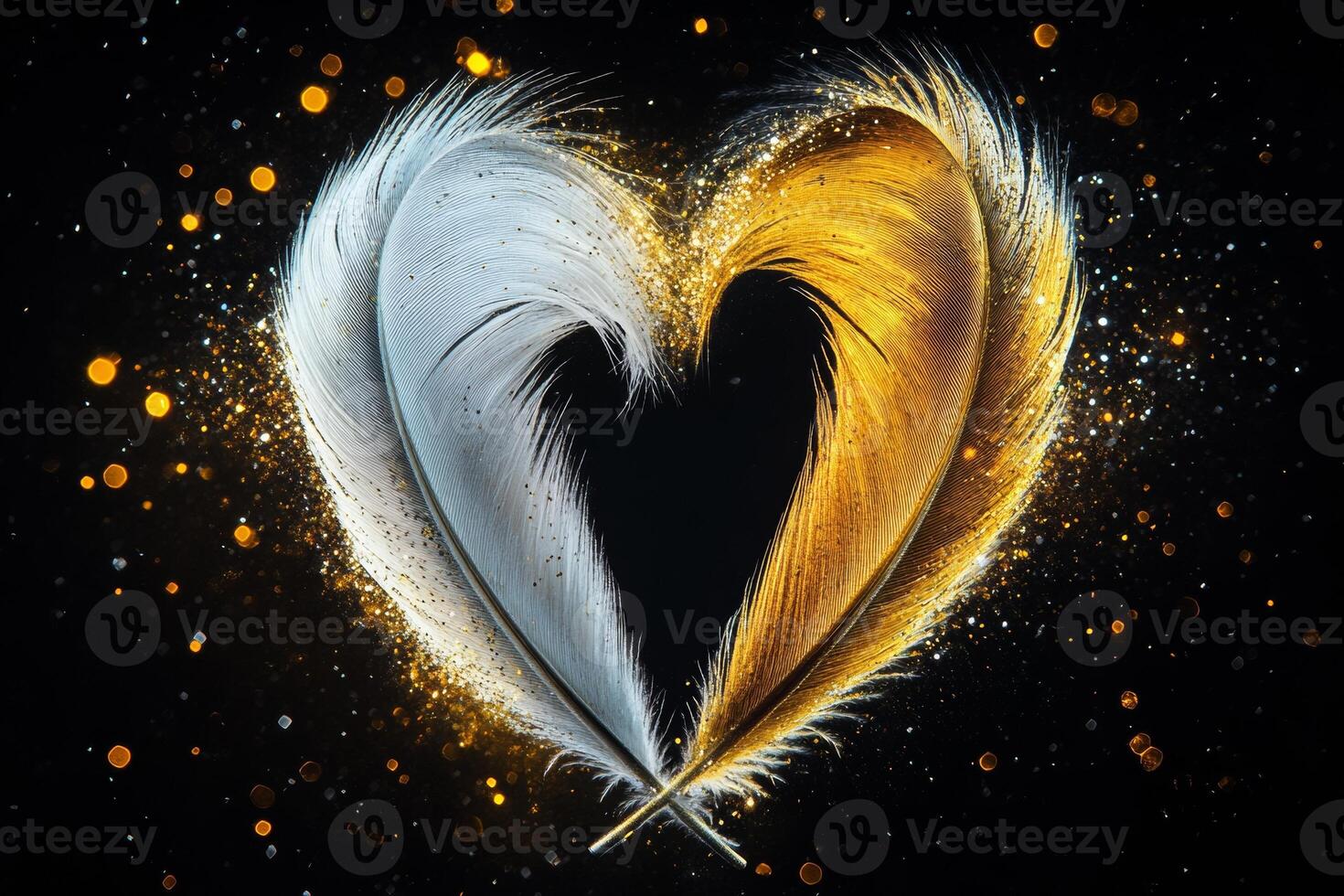 Two delicate feathers, one white and one golden, are beautifully intertwined to form a heart shape. Surrounding them are shimmering particles, creating an enchanting atmosphere Pro Photo