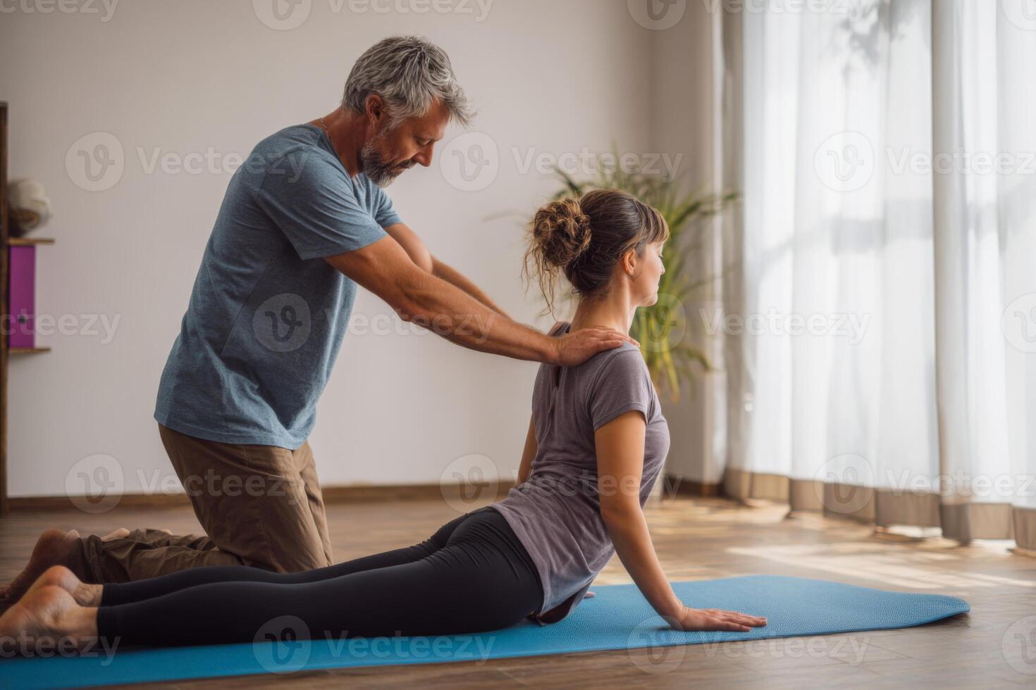 An instructor guides a student through a yoga pose in a well-lit studio. Natural light streams in, creating a calm atmosphere perfect for practice. Both focus on alignment and breath Pro Photo