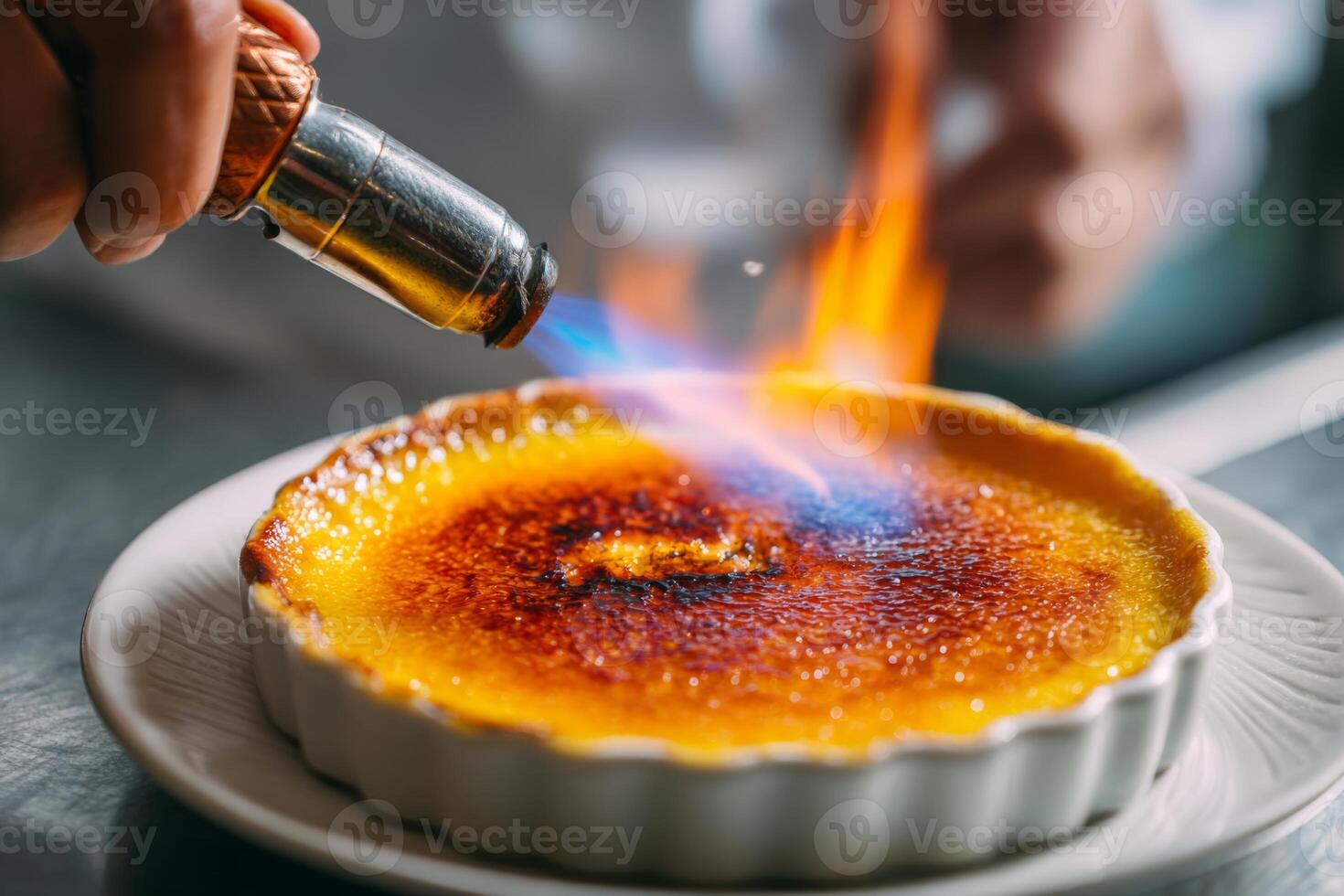 A chef is using a torch to caramelize the top of a creamy dessert in a warm kitchen. The flames create a beautiful golden crust, enhancing its flavor and texture during the culinary event Pro Photo