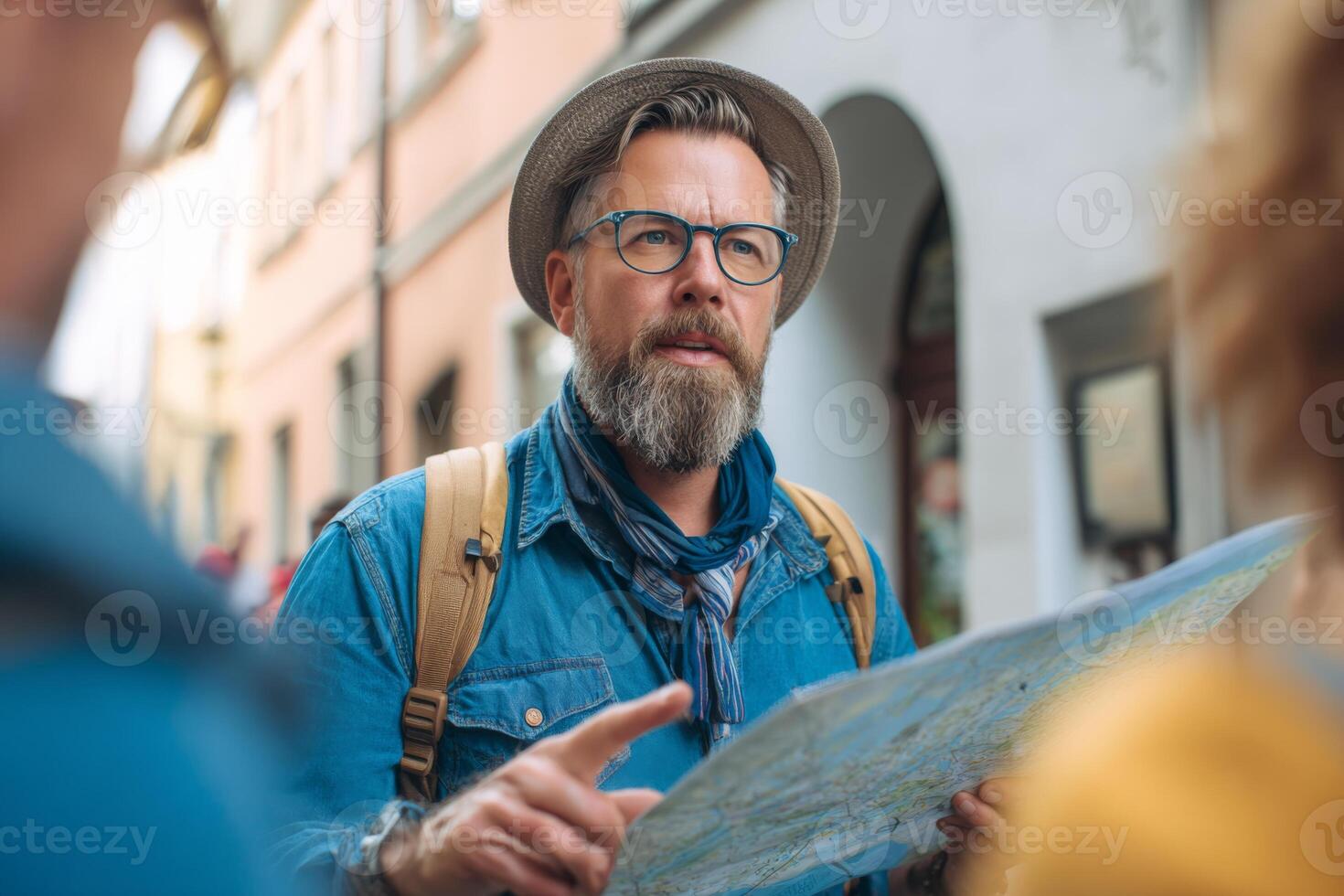 A man with a beard, glasses, and a hat discusses directions with a group. He is holding a map while standing on a busy street filled with colorful buildings Pro Photo