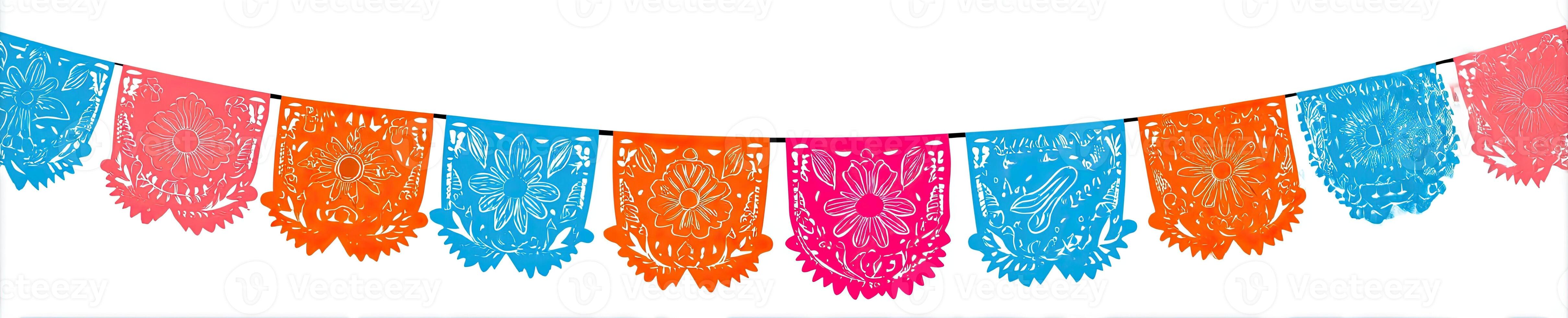 A string of colorful, cut-paper flags hangs against a white background, curved shape Pro Photo