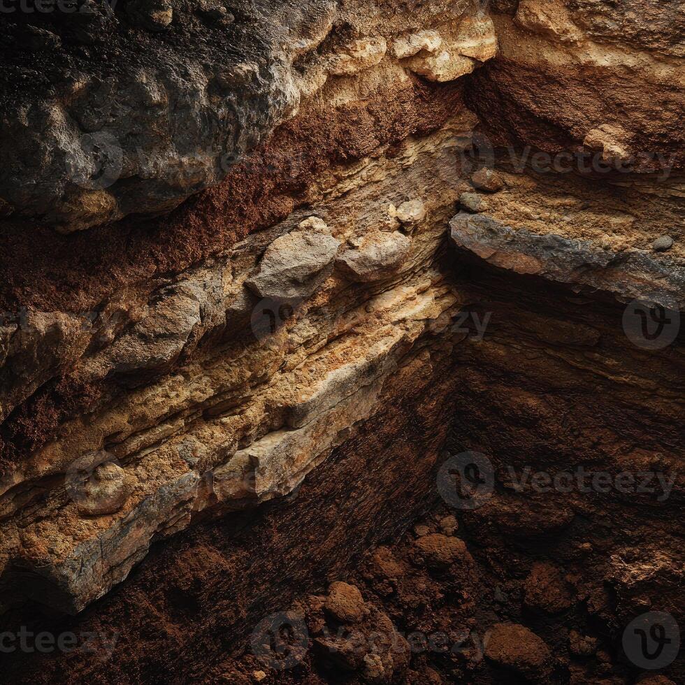 Close-up of layered earth strata. Varied colors and textures of rock and soil layers visible. A geological cross-section Pro Photo
