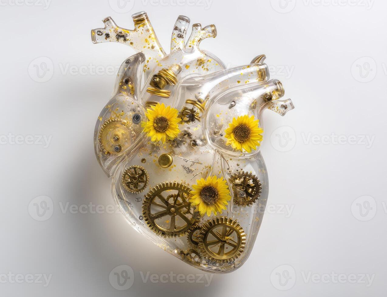 A transparent heart, filled with intricate golden gears and small yellow flowers, sits on a plain white background. Inside the heart, miniature gears and clockwork components are visible, creating a mechanical, botanical design Pro Photo