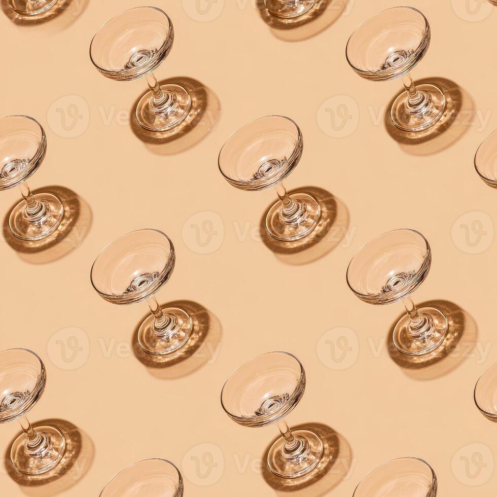 Diagonal repeating pattern of empty stemmed glasses casting distinct shadows on a beige surface Pro Photo