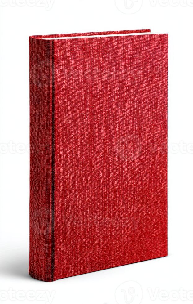 A vertically oriented, isolated, red book with textured cover, casting a slight shadow on white Pro Photo