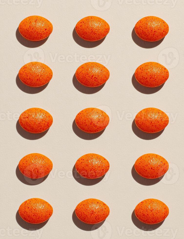 Fifteen orange, pebble-like objects are arranged in a grid, casting small shadows on a tan surface Pro Photo