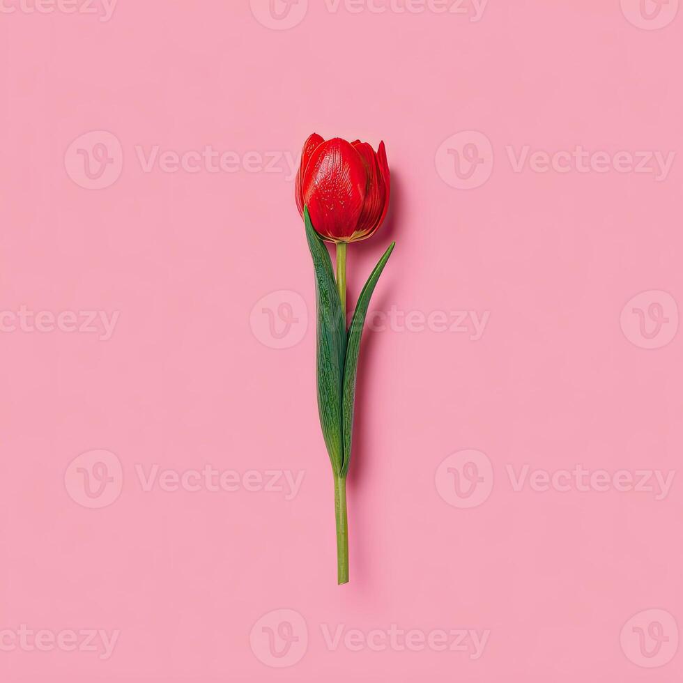 A single red tulip, centered, against a solid pink background, with a close-up view Pro Photo