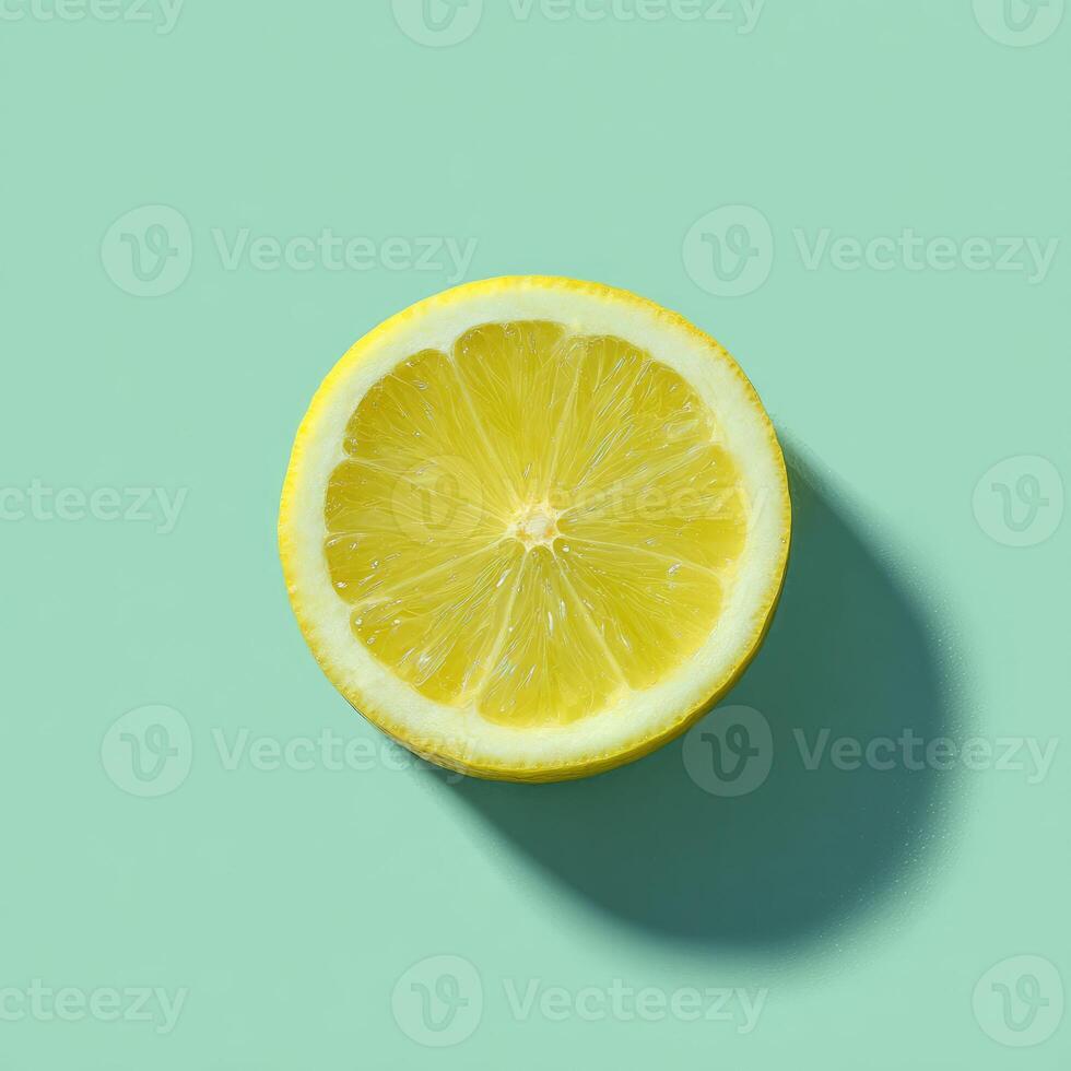 Overhead view of a perfectly sliced lemon on a soft, mint-green background, casting a shadow Pro Photo