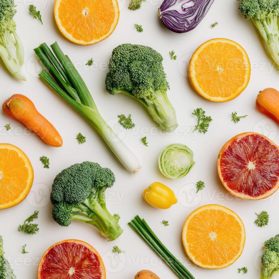 Overhead view of a vibrant array of fresh-cut fruits and vegetables on a white surface Pro Photo