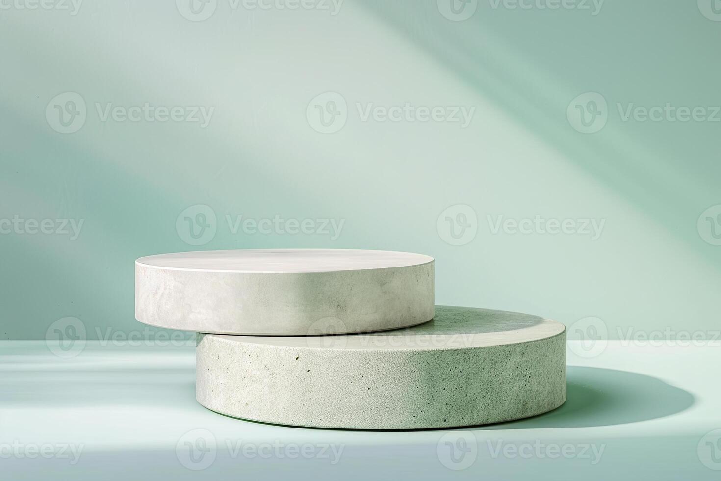 Two Round Podiums for Cosmetic, Soap, Items Presentation. Abstract Minimal Geometric Pedestal. Cylinder Two Forms, Soft Shadow. Product Object Show Scene. Showcase, Display Case. Green Stand Backdrop Pro Photo