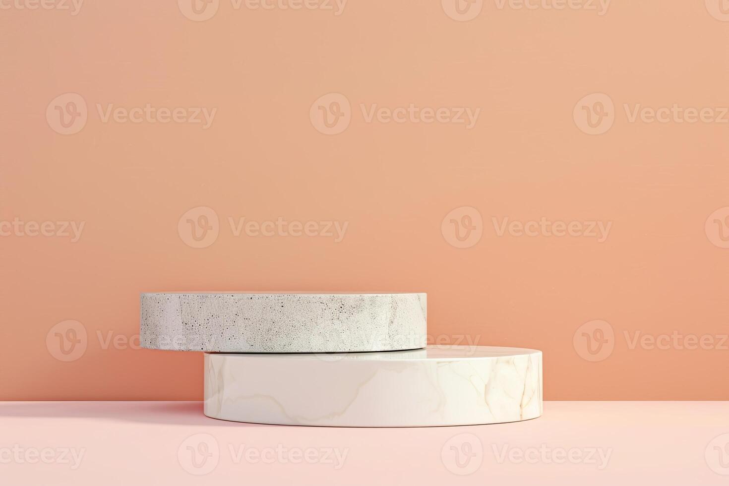 Two Round Podiums for Cosmetic, Soap, Items Presentation. Abstract Minimal Geometric Pedestal. Cylinder Two Forms, Soft Shadow. Product Object Show Scene. Showcase, Display Case. Peach Stand Backdrop Pro Photo