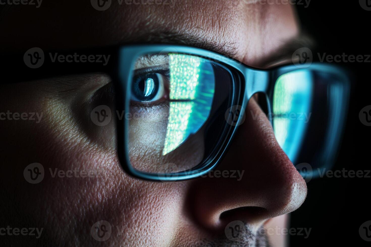 Businessman Analyzing Graphs And Charts. Close Up of Glasses with Reflection Computer Display. Innovation Online Trading, Stock Market Recession. Business. Financial Project. Male Working Data. Pro Photo