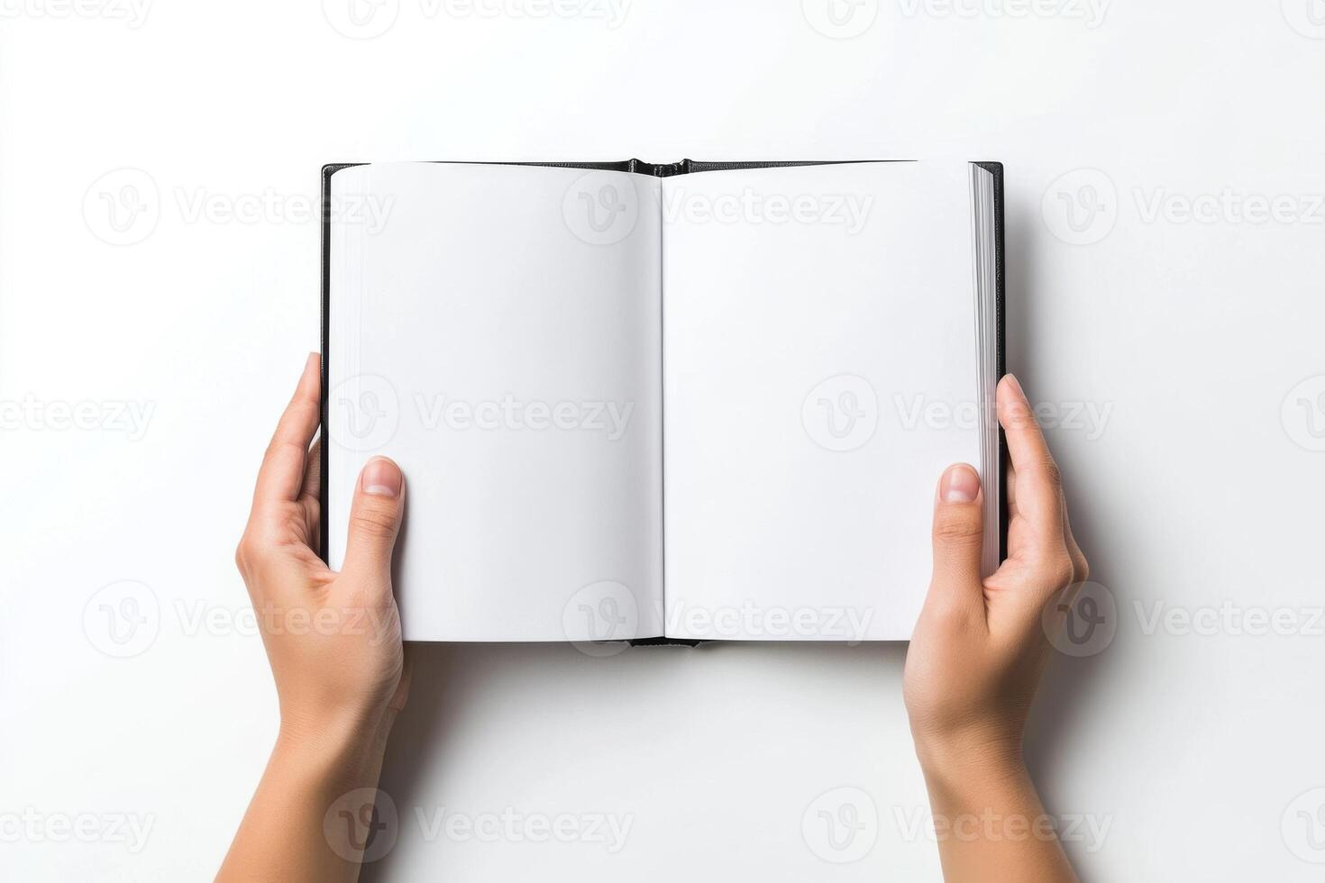 Person holding an opened book with blank pages. Two hands holding a blank magazine or catalog with an open blank white page on a gray background. Template for design, mockup, copy space. Top view Pro Photo