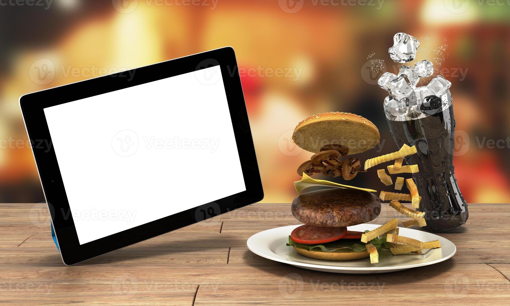 Tablet computer with a blank screen on the wooden table with a hamburger and a glass of cola with ice Free space 3d render Pro Photo