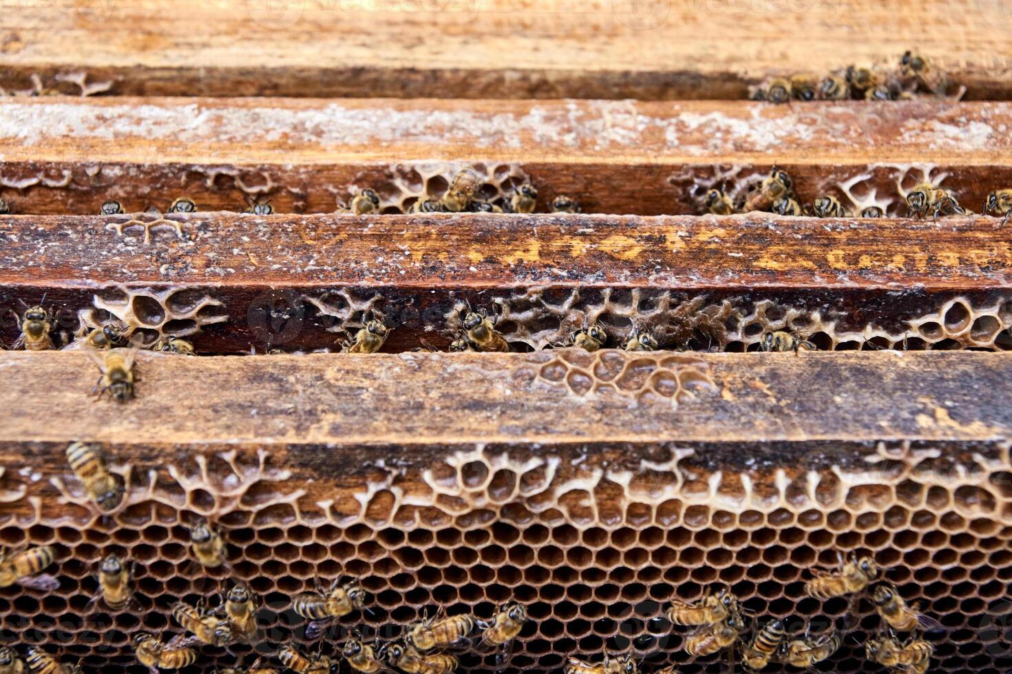 Close-up view of busy honeybees working around beehive frames and honeycomb structure in apiary. Pro Photo