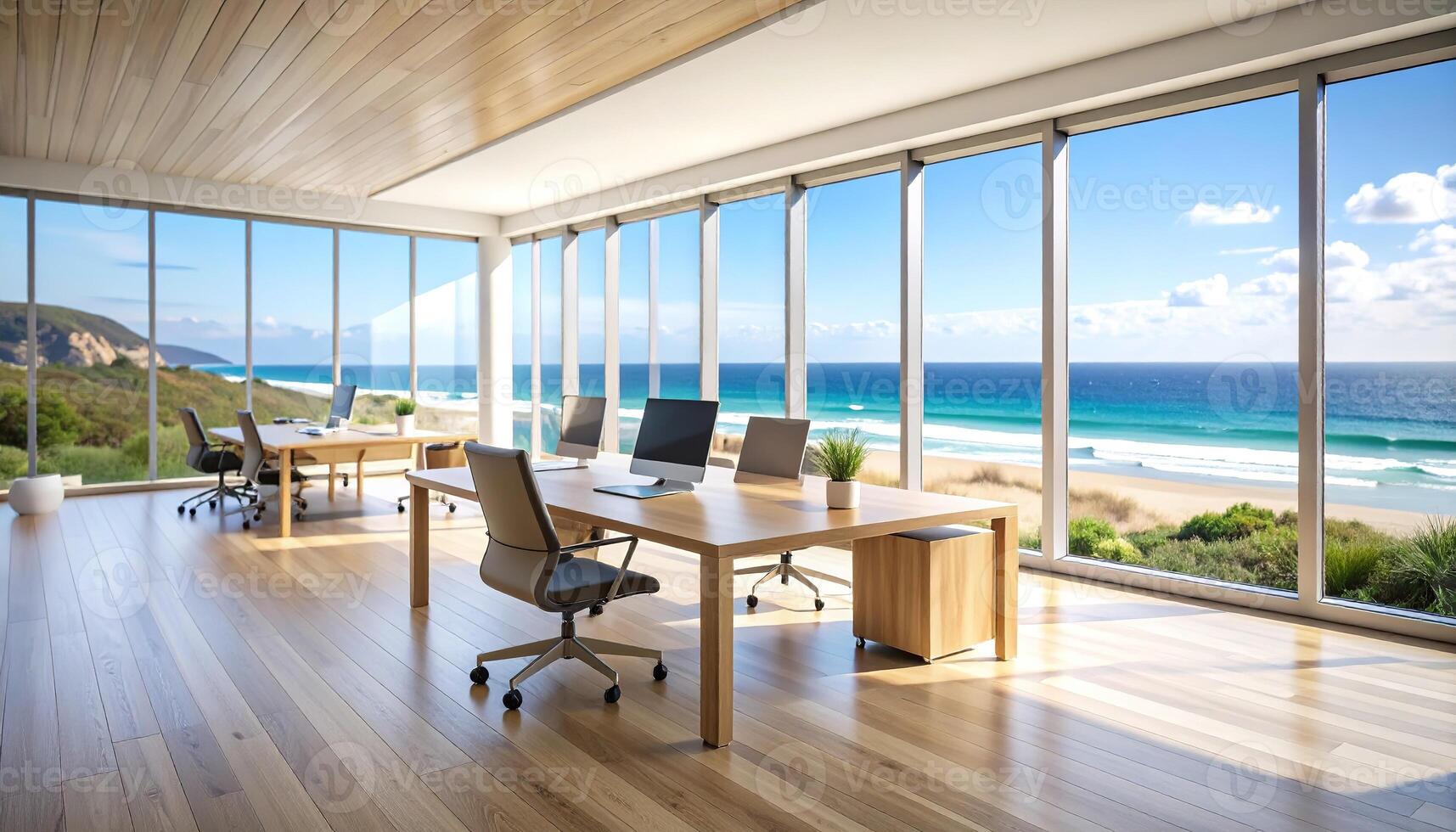 An open-plan office with large windows showcases a stunning ocean view, creating a bright and inviting space. Pro Photo