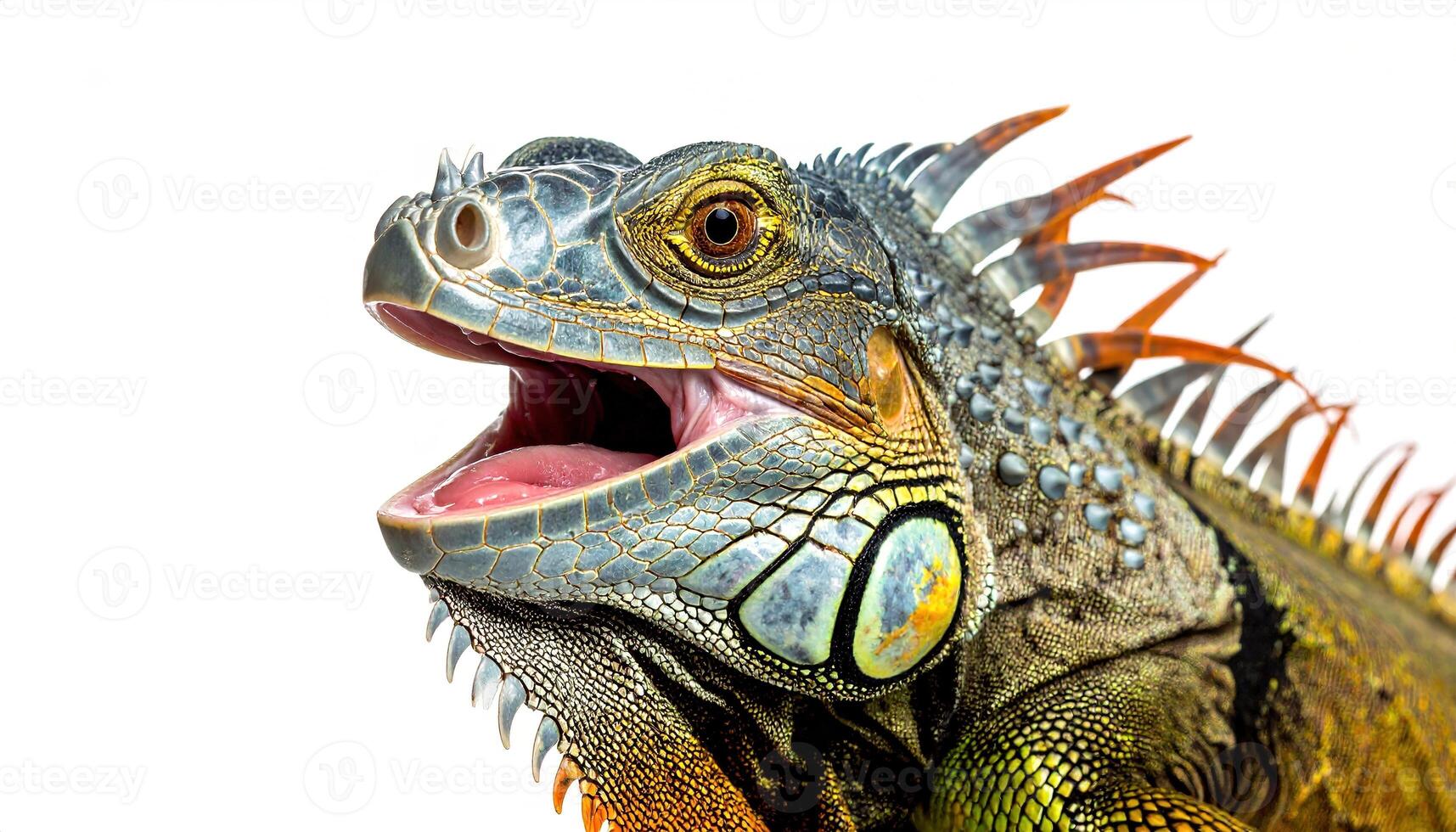 Close-up profile view of a vibrant green iguana with an open mouth, showcasing its intricate scales and striking color patterns against a plain white background. Pro Photo