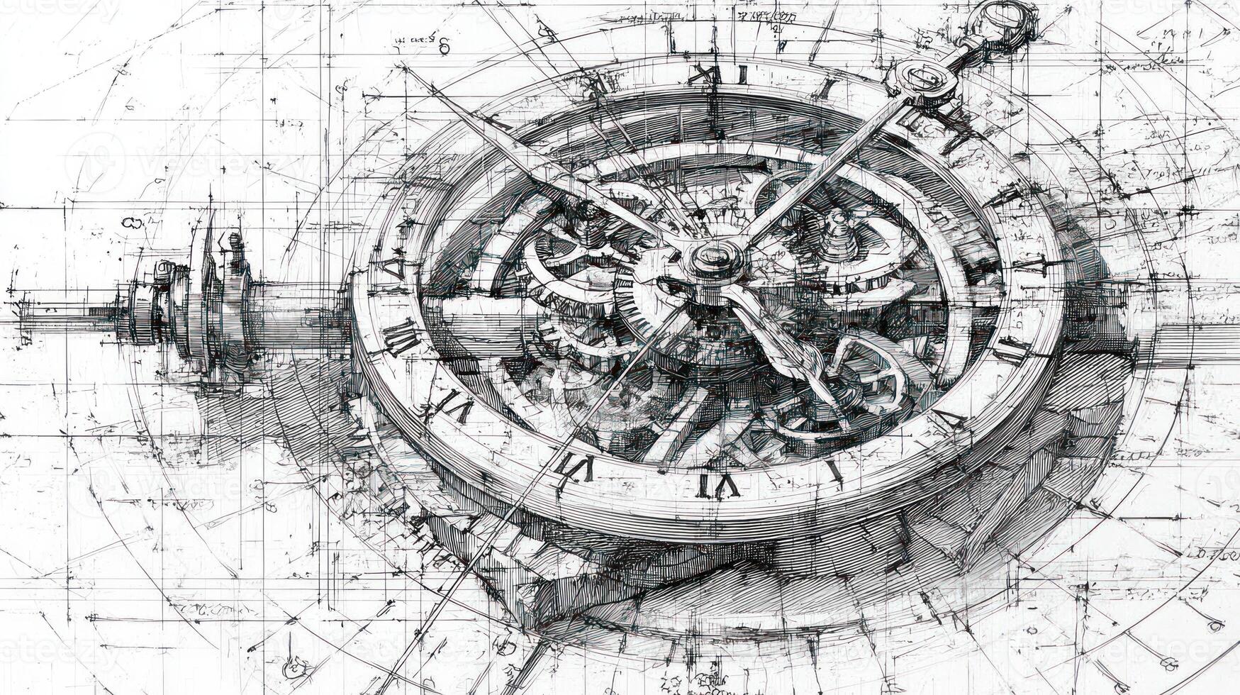 Intricate clockwork drawing, blueprints overlap, gears visible, monochrome Pro Photo