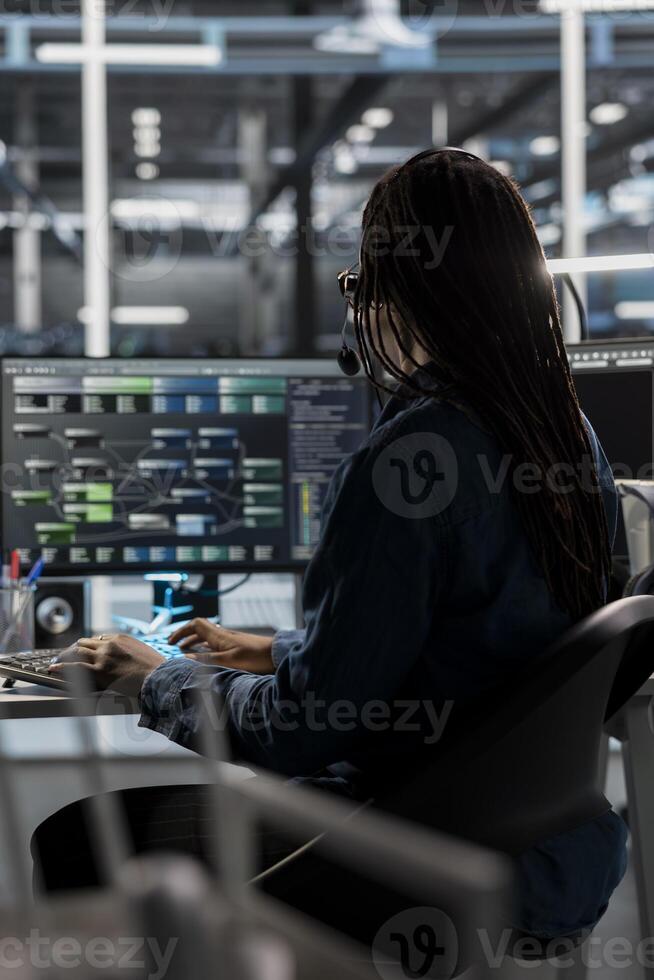 Data center call center agent providing logistics support to businesses, talking in headset mic. Worker in server room establishment overseeing node trees and communicating with engineers Pro Photo