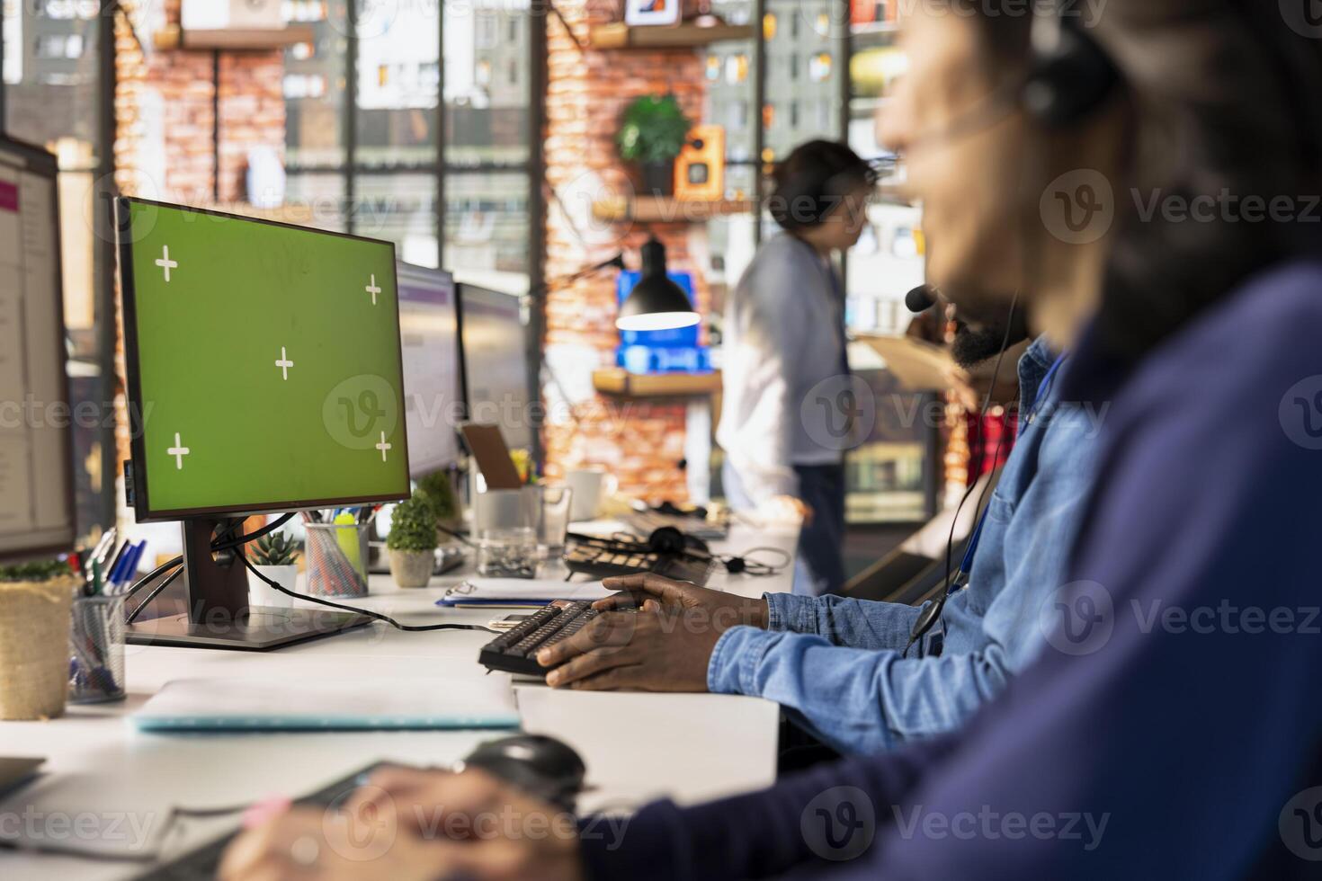 Call center agent using isolated screen PC, handling customer inquiries, complaints and support requests in office. Customer service worker using chroma key computer, assisting customers with issues Pro Photo