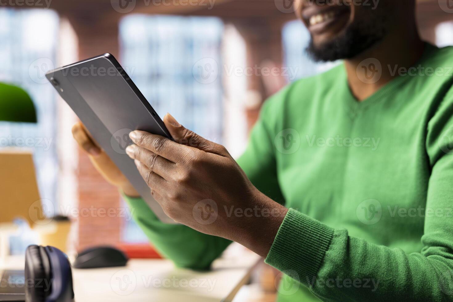 Smiling man at home taking break from work to look at social media feed on tablet, having fun. Happy remote worker in living room pausing tasks to use social network application on device, close up Pro Photo