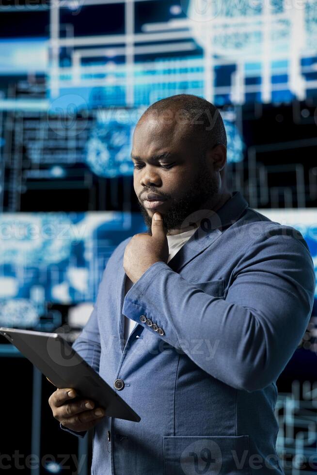 Black smart IT engineer examining artificial intelligence brain systems using cloud computing tools and advanced programming. Using machine learning for virtual assistant automation. Pro Photo