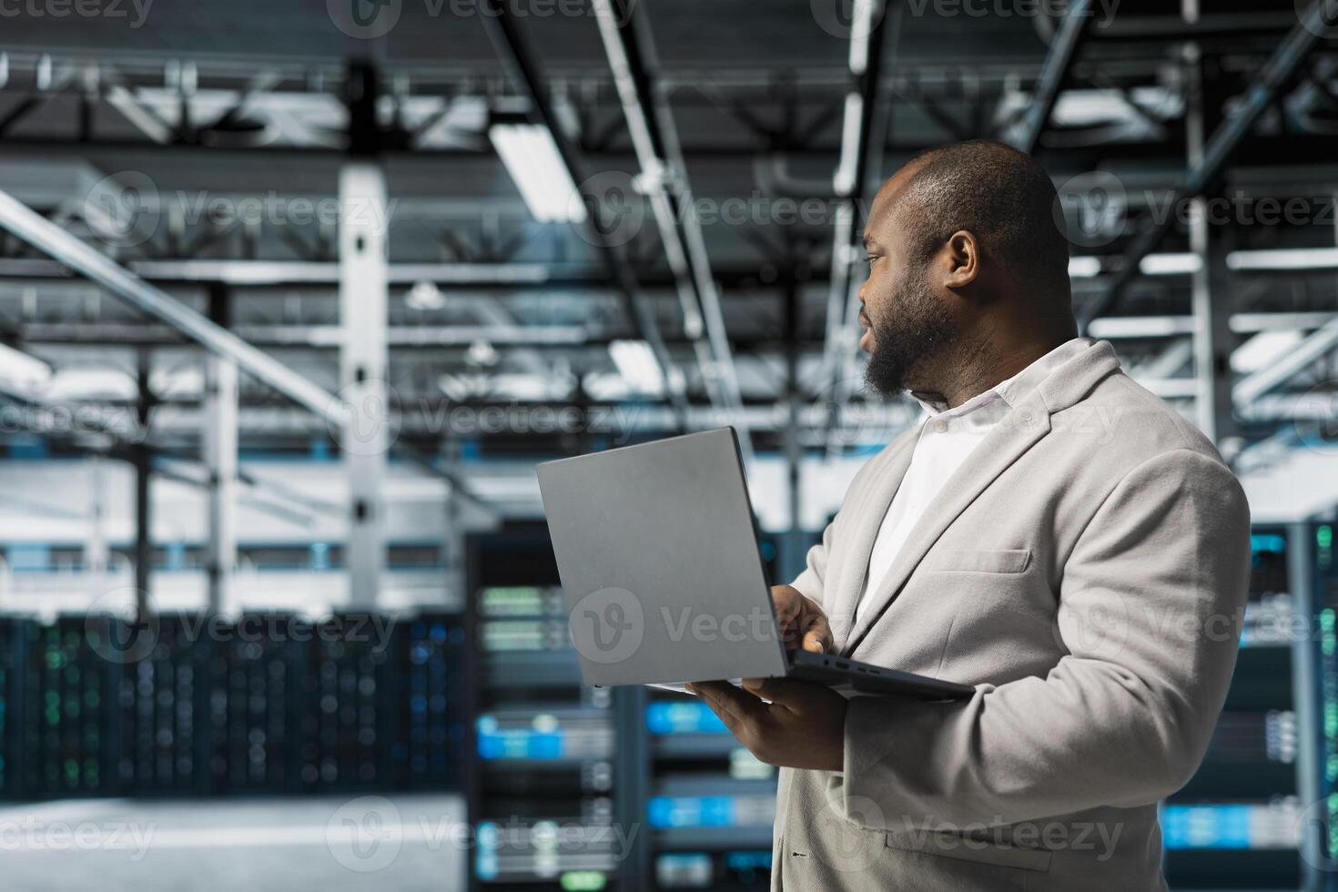 Programmer in data center using laptop, reading error logs, doing checkup to prolong hardware life span and avoid downtime. Server hub workplace employee monitoring infrastructure rigs using notebook Pro Photo