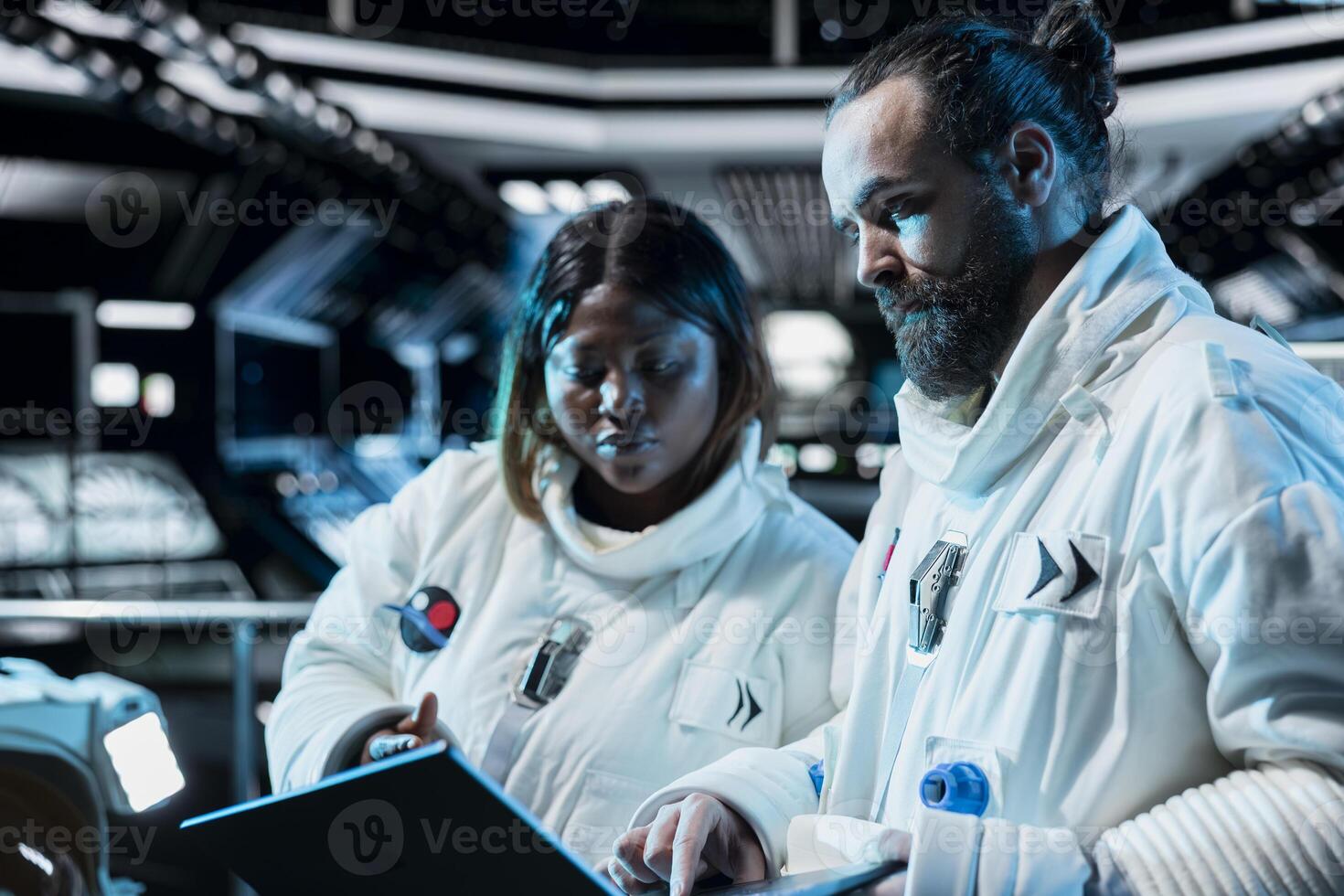 Teamworking astronauts calibrating sensors, using laptop to confirm suit integrity. Cosmonauts in spacecraft powered by advanced engineering testing gear during routine equipment check Pro Photo