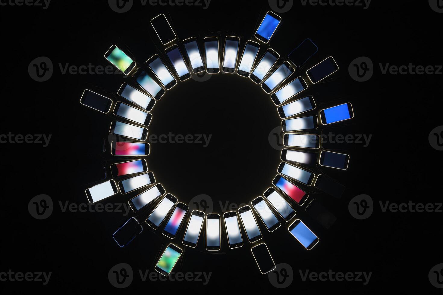 Creative display of smartphones arranged in a circular pattern with colorful screens Pro Photo