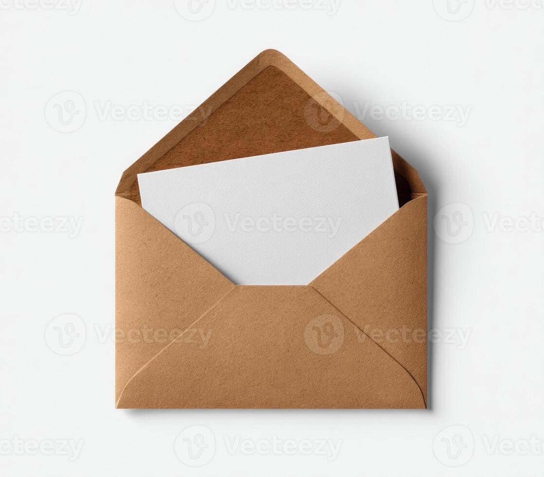 A top-down view of a brown envelope with a blank white card inside, on a white surface Pro Photo