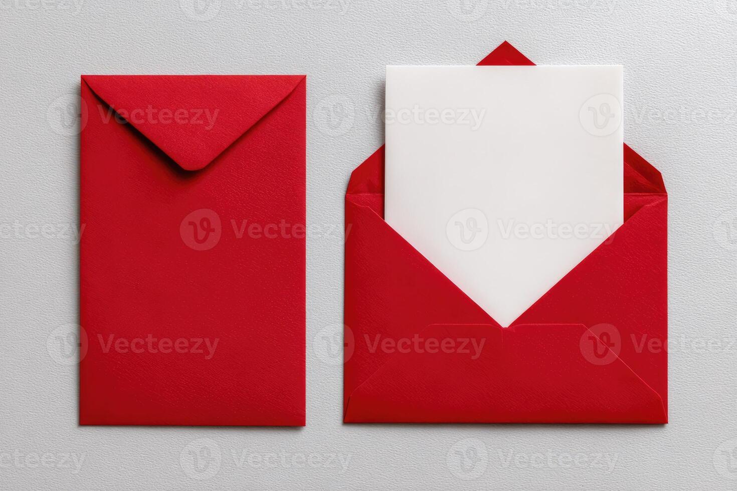 Two vibrant red envelopes, one closed, one open with a blank white card inside, on a gray backdrop Pro Photo