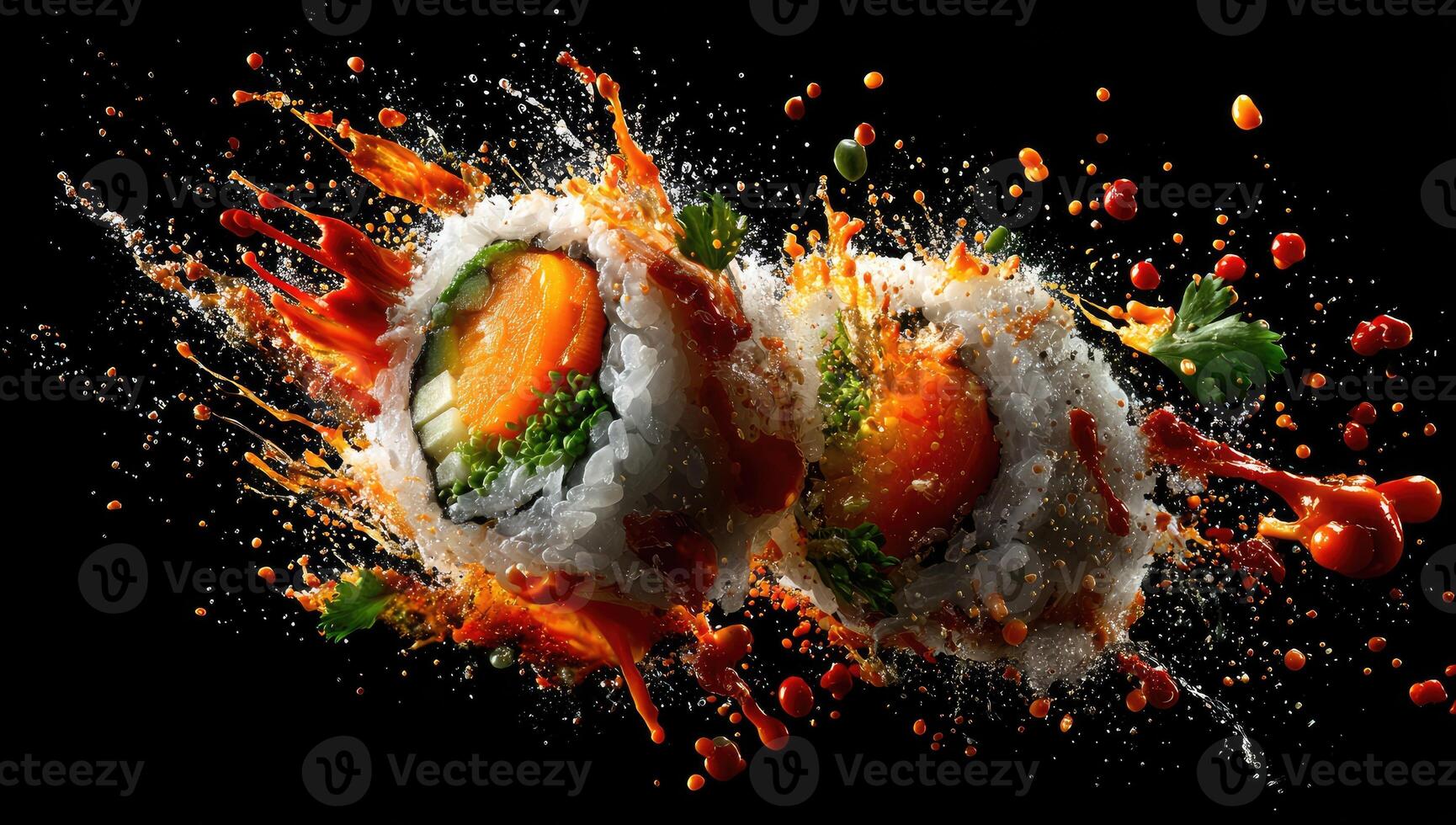 Sushi rolls explode with vibrant orange sauce against a stark black backdrop, creating splash Pro Photo