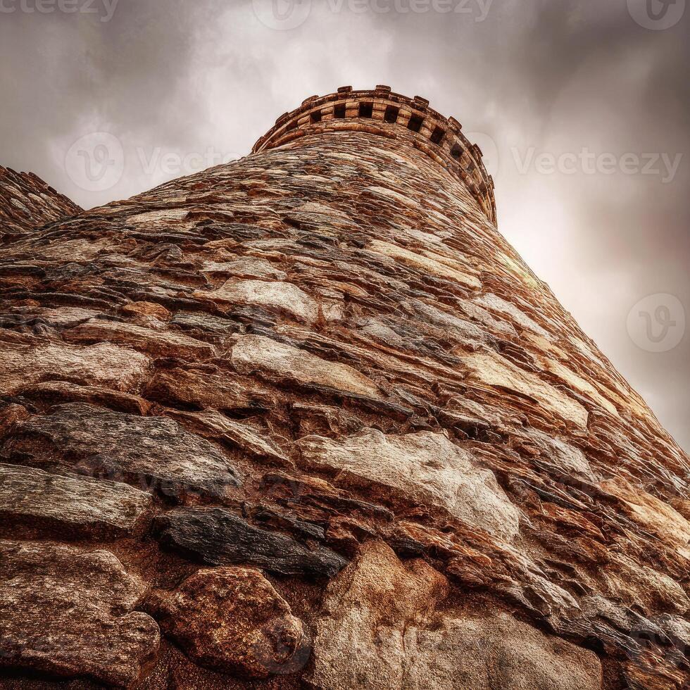Low-angle shot of a stone-built, conical structure with a crenelated top against a cloudy sky Pro Photo