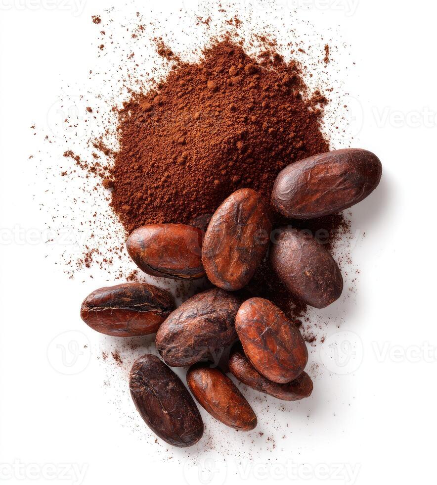 Cocoa powder and beans. A top-down view of cocoa powder scattered over a pile of cocoa beans on a white background. The beans are various shades of brown and appear whole Pro Photo