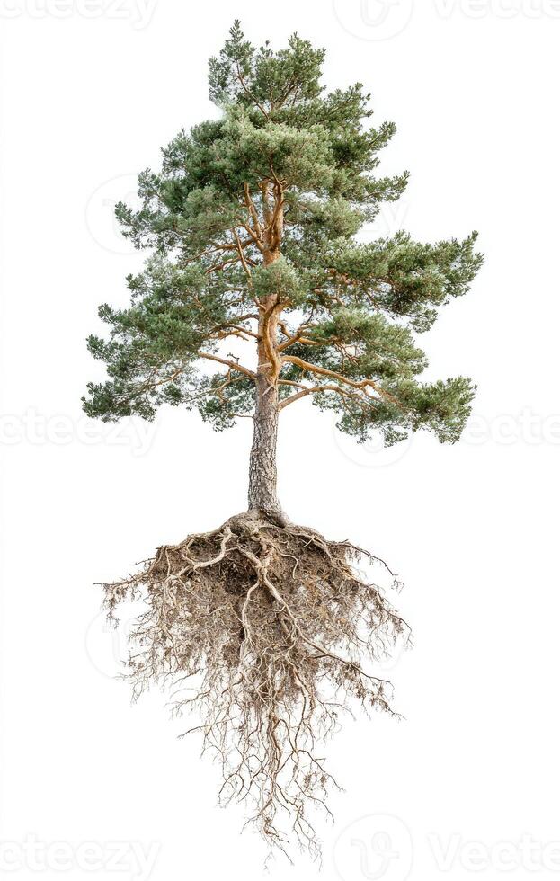 Full view of a pine tree with its extensive root system, isolated against a pure white background. The tree displays a full, healthy canopy of green foliage and a sturdy, light brown trunk. The roots spread widely beneath the soil Pro Photo