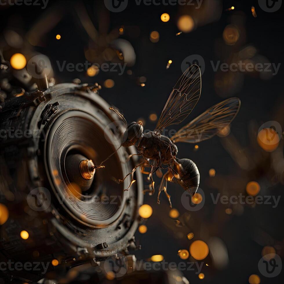 A metallic speaker with a wasp in flight, surrounded by glittering particles, creates a vibrant, dark, and dynamic scene Pro Photo
