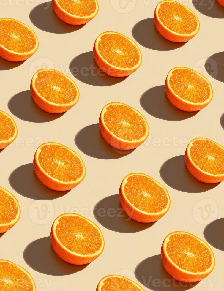 Halved oranges arranged in a repeating pattern casting long shadows on a light beige background Pro Photo
