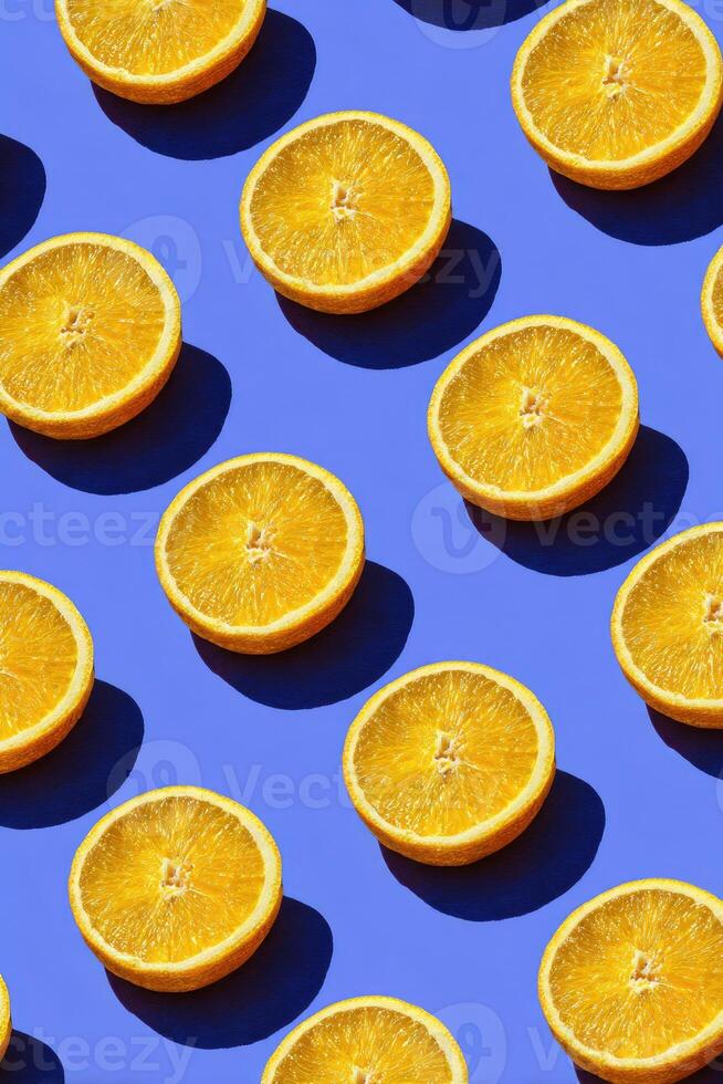 Pattern of sliced oranges on a vibrant blue background, creating a dynamic, fruit-filled visual Pro Photo