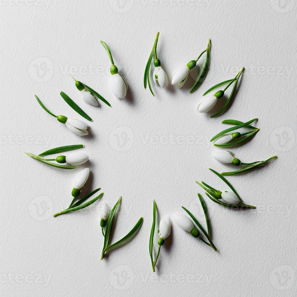 A symmetrical, top-down view of snowdrop flowers arranged in a circular pattern Pro Photo