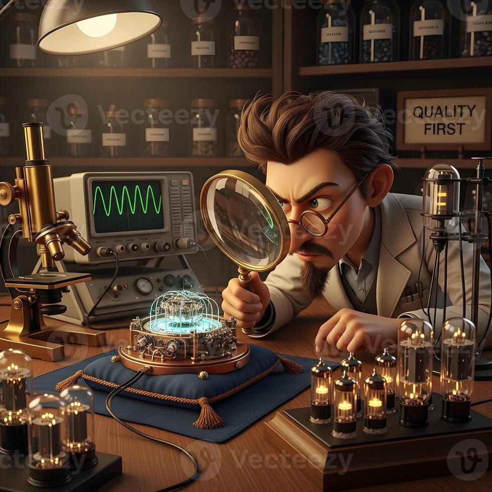 Quixotical quality control engineer inspecting quantum encrypted quartz crystal oscillator in a quaint laboratory setting Pro Photo