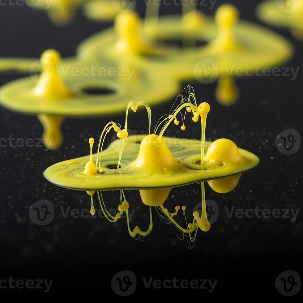 Vivid Radiant Yellow Ink Droplets in Slow Fusion A Macro Visual Journey Through Fluid Dynamics, Exquisite Textures, and Reflective Elegance. Pro Photo
