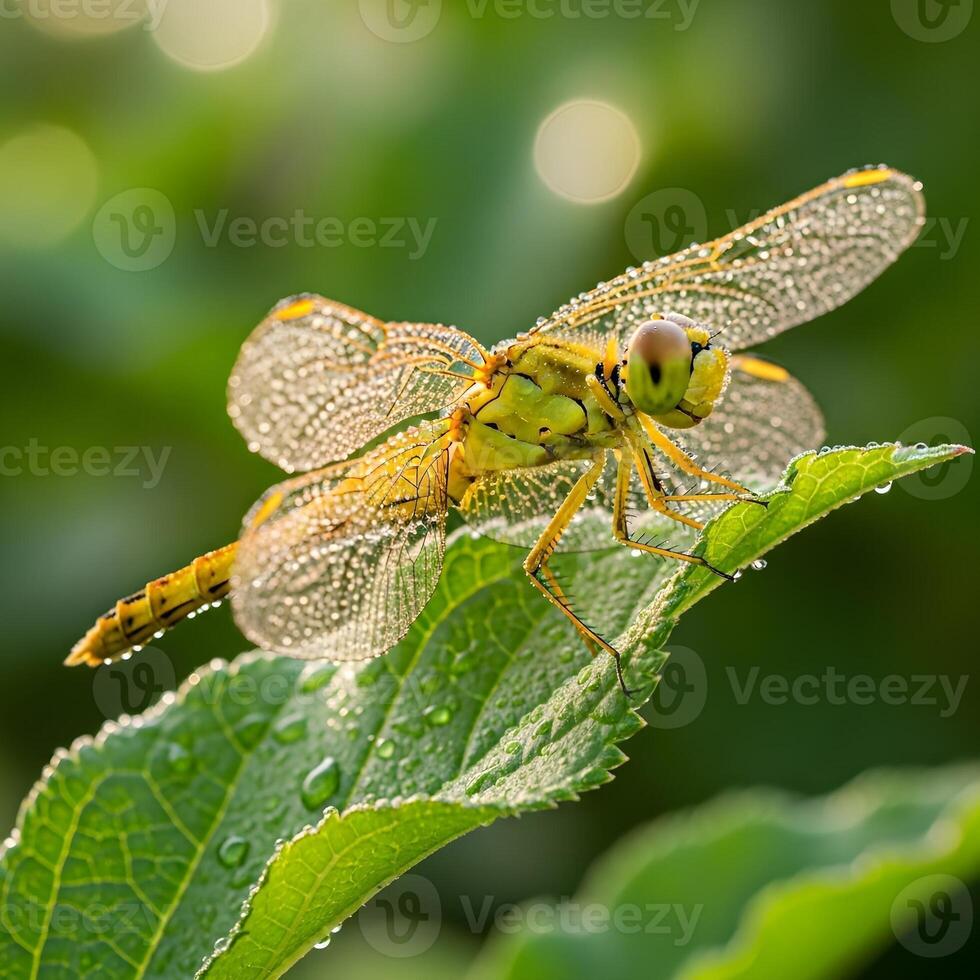 Macro Masterpiece Vivid Yellow Dragonfly Resting on a Dew-Laden Leaf with Intricate Wing Textures and Elegant Natural Patterns in Focus Pro Photo